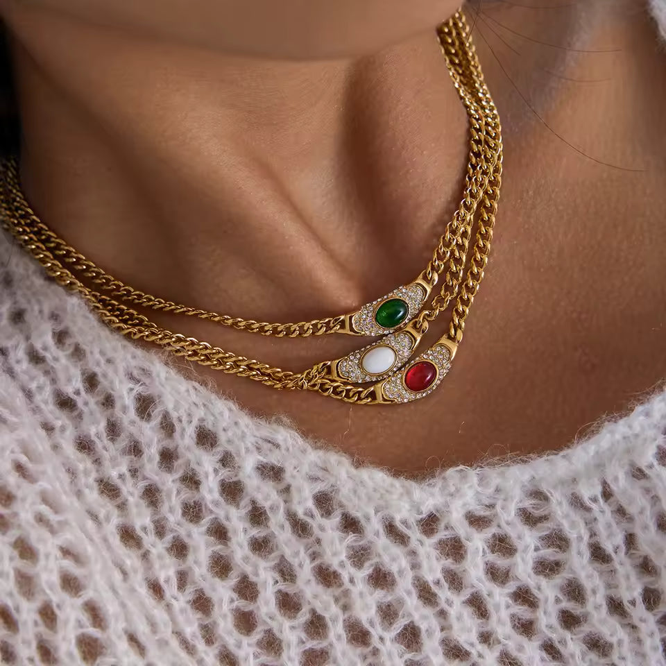 This gemstone necklace captures that timeless aesthetic with rich color and golden details that nod to another era. The kind of piece that looks just as good with a casual sweater as it does for an evening out.